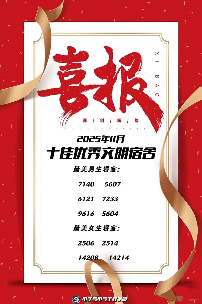 在安全检查上,重点排查热得快、大功率取暖器等违规电器,未发现私自使用大功率违规电器情况。学生干部结合秋冬季节特点,向同学们强调用电用火安全,讲解违规电器危害、火灾预防及逃生知识,提升大家安全意识,引导共同维护宿舍安全环境。经综合评定,男生寝室:7211、7320、7216、5240、6137。女生寝室:2506、14211、2516、2106、1626,在卫生、安全等方面表现突出,获评11月优秀寝室。