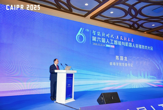 在大会开幕式上,陈国龙代表联合主办单位致辞。他指出,以人工智能与机器人为代表的新一轮科技革命,正以前所未有的深度与广度推动新质生产力发展,从智能制造到具身智能,技术突破持续涌现、融合应用日益加快。在此背景下,各界齐聚一堂围绕关键技术开展研讨,恰逢其时、意义深远。“独行快,众行远”,他强调科技的生命力在于开放合作,期待本届大会成为思想碰撞、协同创新的平台,推动各方携手攻关关键技术瓶颈,共同将创新势能转化为发展动能。陈国龙代表学校诚挚邀请与会专家到蚌埠学院指导交流。
