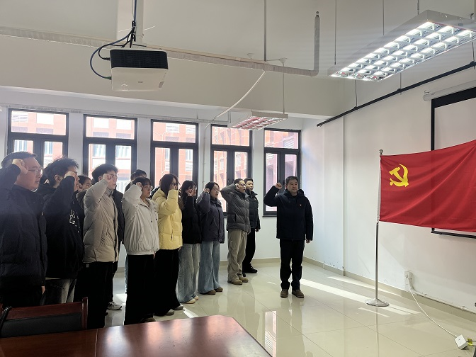 在党旗的见证下,新党员们整齐列队,面向鲜红的党旗,举起右手,在哈焱的带领下进行庄严宣誓。