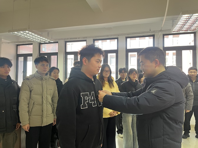 宣誓结束后,哈焱为每一位新党员佩戴了党徽,并要求他们在今后的学习、生活中要牢记党员身份,凡事先人一步,充分发挥党员先锋模范作用。