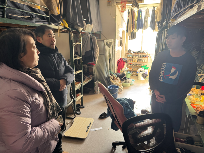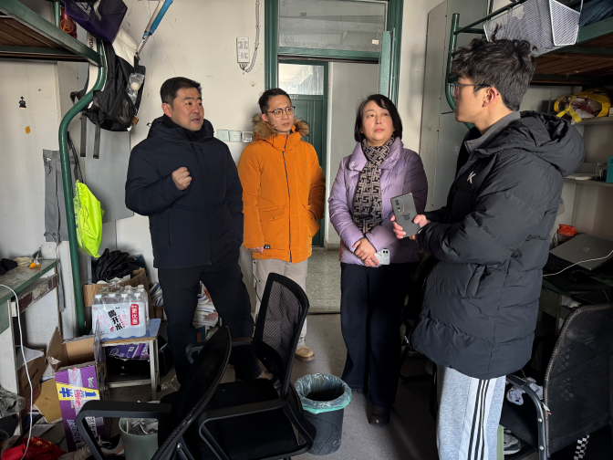 走访过程中,慰问组一行细致查看了各宿舍的防寒保暖、用电安全及卫生状况,并与同学们进行了亲切深入的交流。哈书记详细询问了每位留校学生的具体原因、生活安排、学业进展及面临的实际困难。他特别强调,安全是底线,提醒同学们务必注意极端天气下的出行安全、宿舍用电规范及个人健康防护;同时鼓励大家合理规划假期时间,在保障休息的前提下,充分利用学校资源,稳步推进科研任务、学业复习或实习实践,实现假期期间的自我提升。在交谈中,马书记始终将学生的成长需求置于更广阔的视野中加以审视。她不仅关切地询问同学们在严寒中的基本生活保障,更将对话引向深层的意义价值维度,将“物理保暖”延伸为对心灵状态与成长韧性的温暖守护。慰问组还现场协调解决了同学们反映的部分生活不便问题,并明确表示,学院将建立寒假留校学生动态联络机制,确保信息畅通,提供及时必要的支持,包括但不限于学习资源对接、生活便利协调与应急援助。